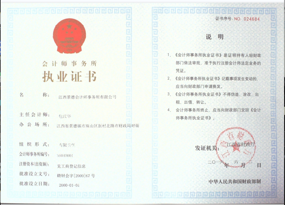 江西景德会计师事务所前身为景德镇市财政局直属事务所,成立于1988年,2000年脱钩改制,经江西省财政厅赣财会字[2000]67号文批准,江西省工商行政管理局登记注册的一家具有法人资格的社会中介机构,逐步发展形成现在规模。事务所所在地在江西景德镇市新村北路18号,法定代表人:包汉华。