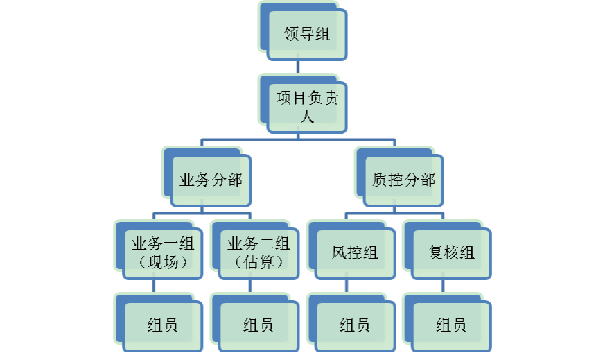 项目领导组全面负责委托的评估项目,统一管理协调各项工作,项目领导组由公司法定代表人、总经理和首席评估师组成。针对委托评估项目设立业务分部和质控分部,负责具体的评估工作。