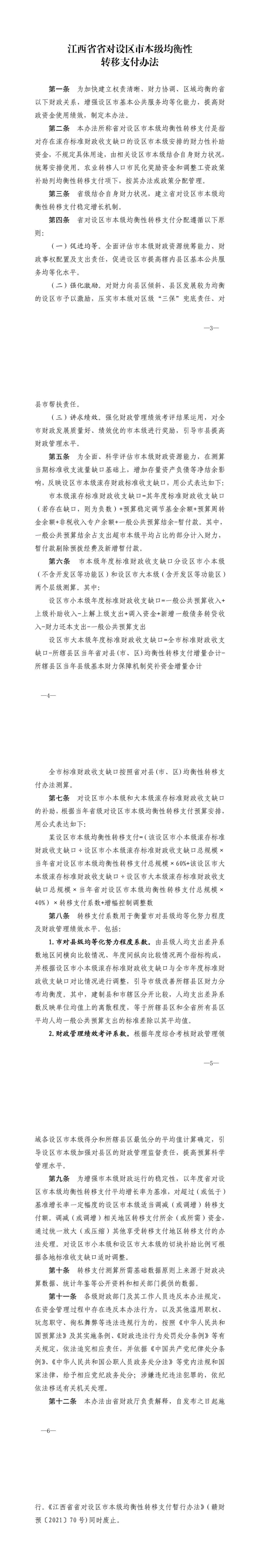 2021年,我省首次设立了省对设区市本级均衡性转移支付,设区市本级统筹保障能力得到有效提升。为进一步深化省以下财政体制改革,加快建立权责清晰、财力协调、区域均衡的省以下财政关系,增强市本级推进所辖县区基本公共服务均等化能力,提高资金使用绩效,近日,省财政厅对2021年省对设区市本级均衡性转移支付暂行办法进行了修订,印发了《江西省省对设区市本级均衡性转移支付办法》(赣财预〔2024〕40号),确立了省对设区市本级均衡性转移支付“奖补并重”的分配机制。