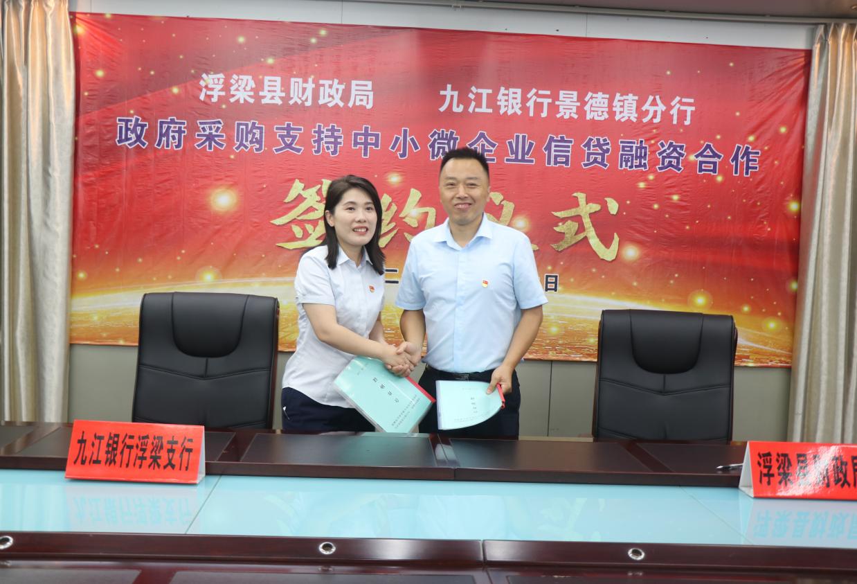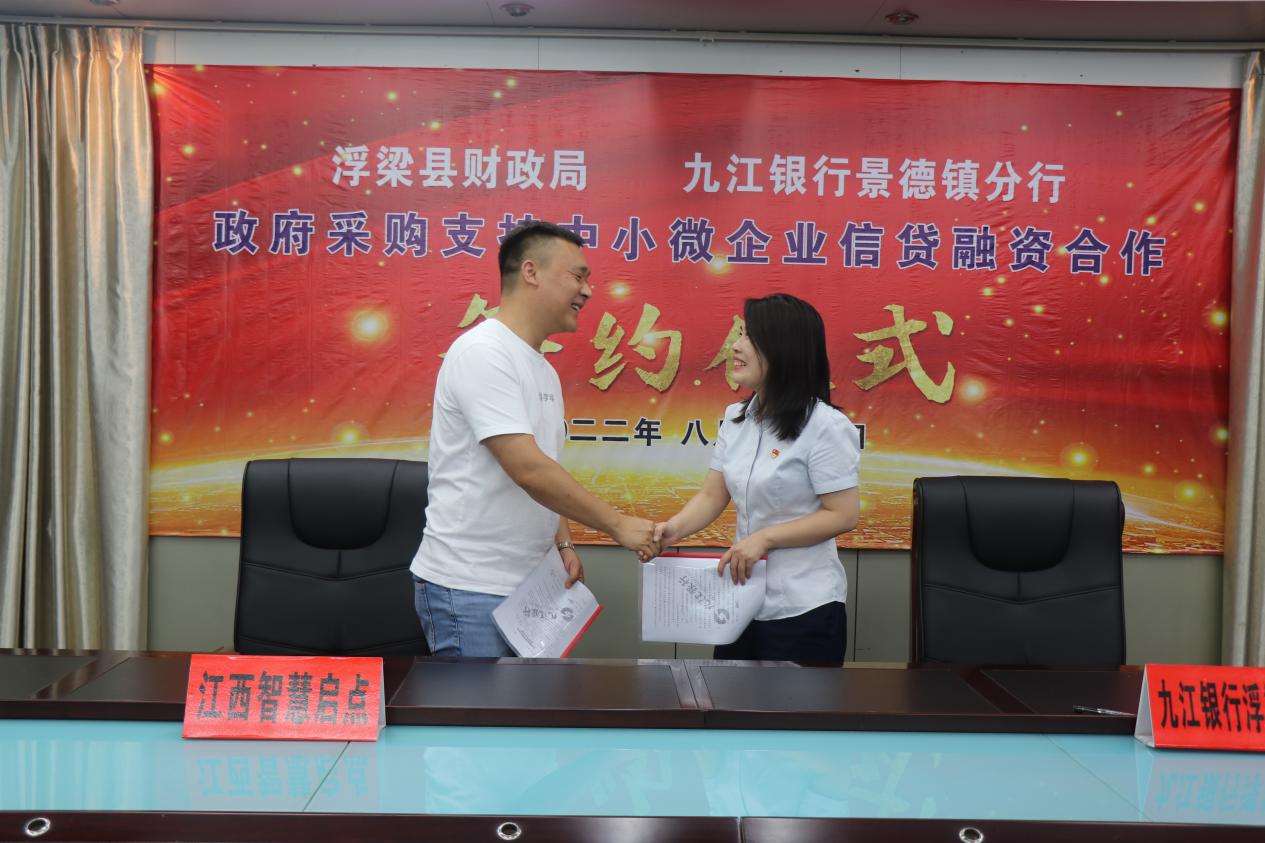合作签约现场,九江银行浮梁支行就促成了浮梁县第一笔政府采购信用融资贷款项目——江西智慧启点工程有限公司政府采购信用贷款150万元。